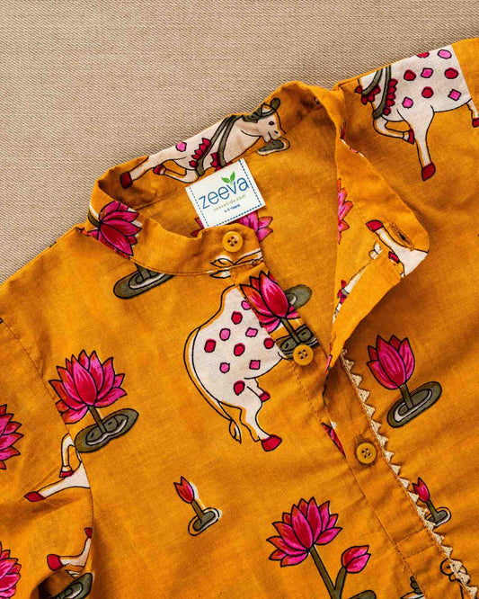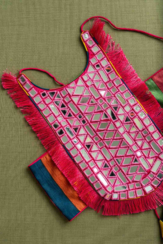The yellow chaniya choli for kids brings cheer and vibrancy to Navratri and Garba celebrations. Detailed with playful tassels and mirror work, it’s perfect for kids who love to twirl and dance. The bright colour also symbolises joy and energy for your kid, making it a festival favourite for them.