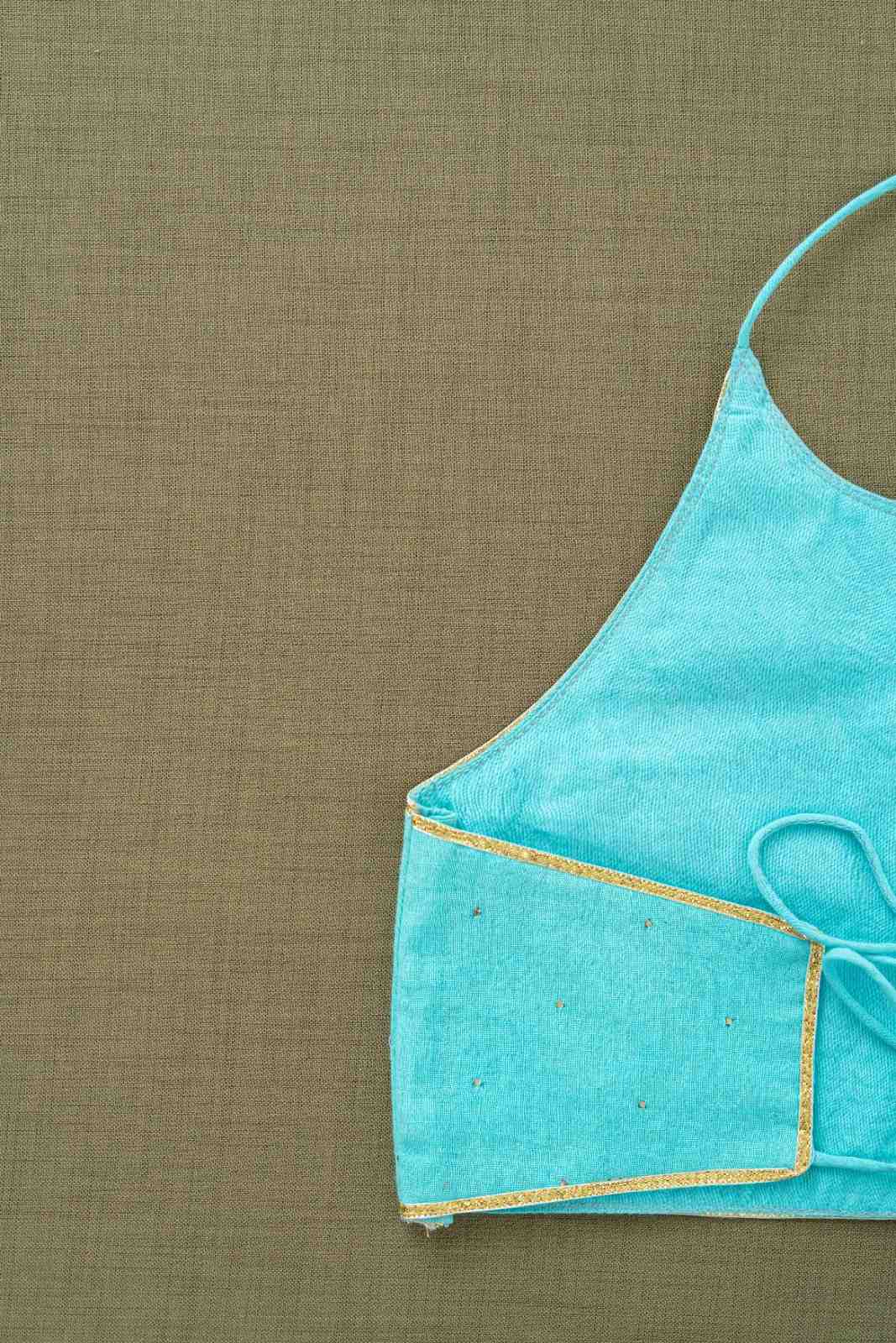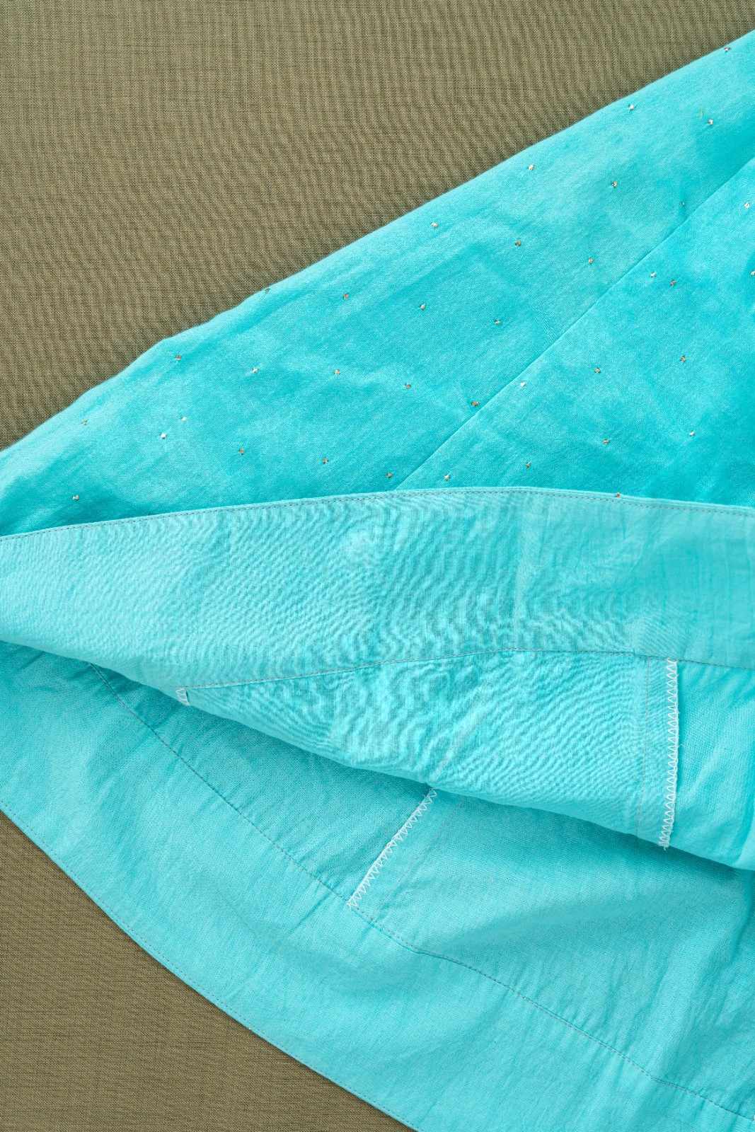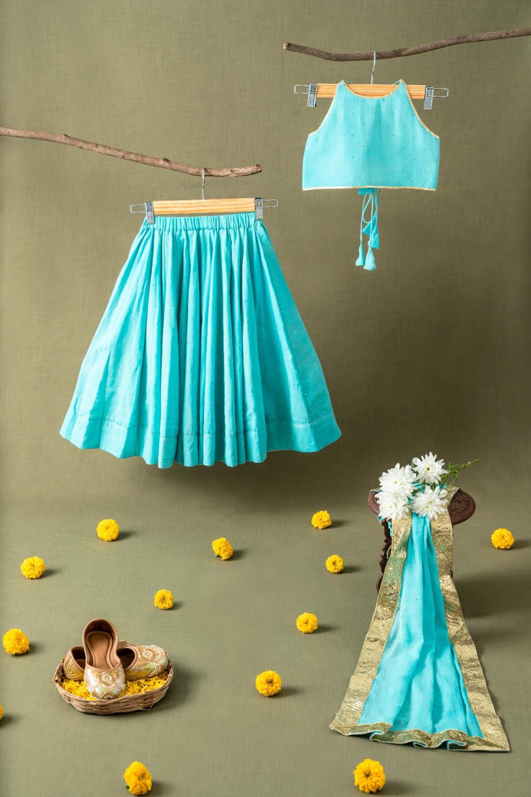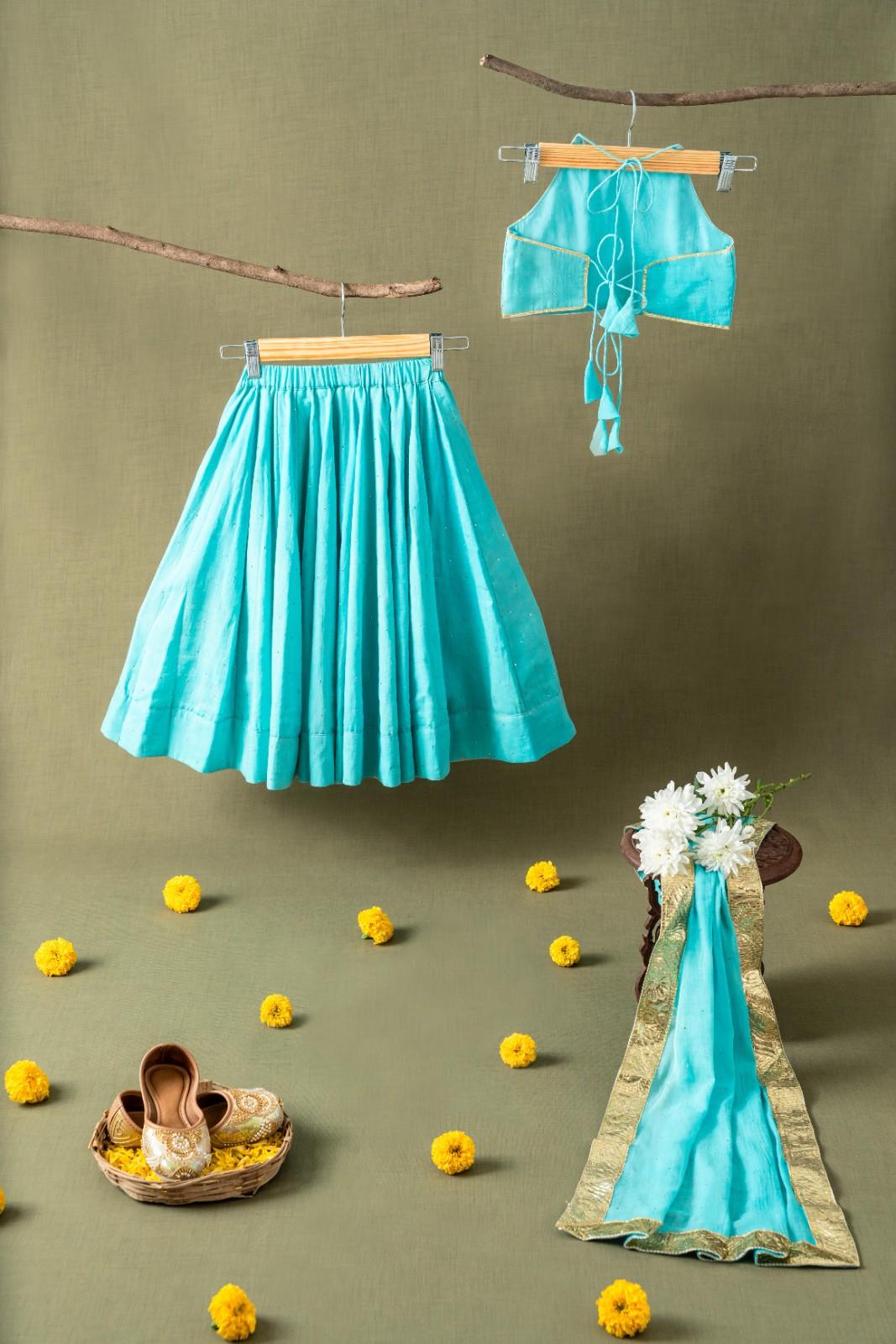 Lehenga: A breezy sky-blue mul skirt with graceful gathers, offering comfort with style.