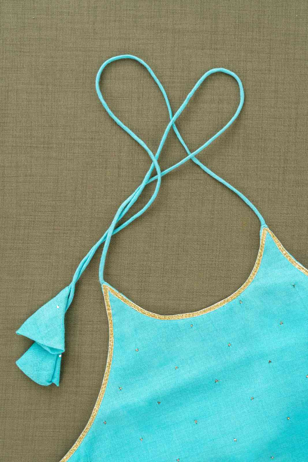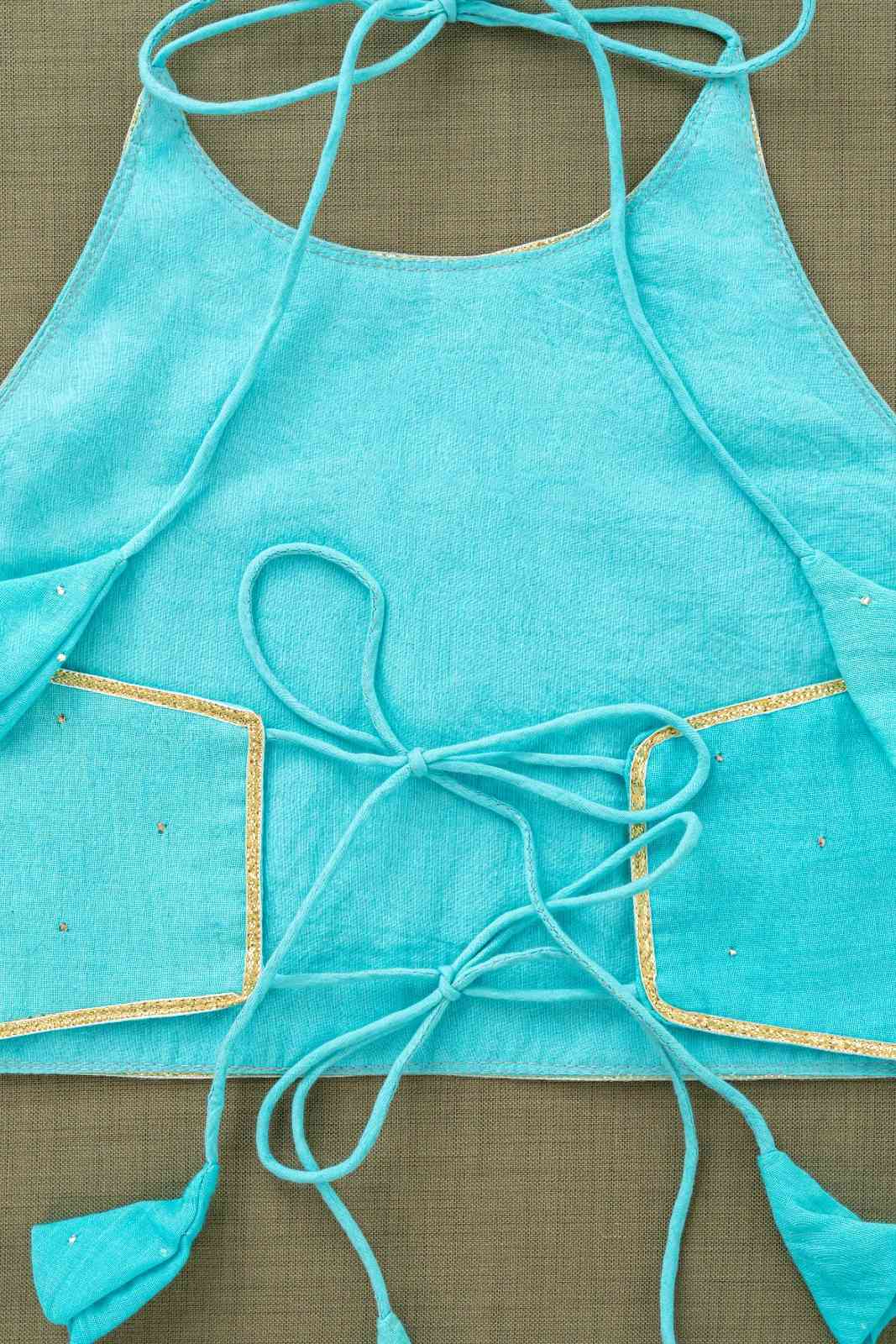 Bring timeless charm to your little one’s festive wardrobe with this Pure Mul with Mukaish Lehenga Choli. Crafted in lightweight and breathable mul cotton, the set features a sky-blue gathered lehenga, a sleeveless tie-up choli, and a matching dupatta finished with a rich golden border. Subtle mukaish work adds just the right touch of sparkle, making it perfect for weddings, festivals, and special celebrations.